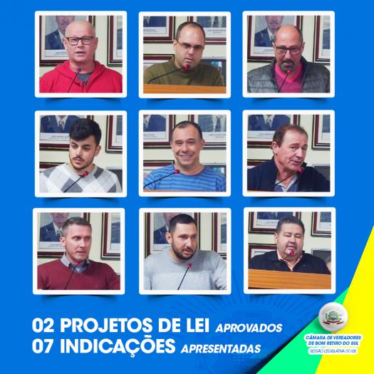 Na última sessão ordinária, tivemos sete Indicações de Melhorias e dois Projetos de Lei aprovados pelos legisladores municipais, com destaque ao Programa de Auxílio Financeiro Emergencial que destinará R$ 40.000,00 de benefício aos profissionais autônomos, microempreendedores individuais, pequenos e microempresários estabelecidos no Município de Bom Retiro do Sul, para enfrentamento do estado de Calamidade Pública e dos consequentes impactos sociais e econômicos decorrentes da pandemia do Coronavírus (Covid-19).