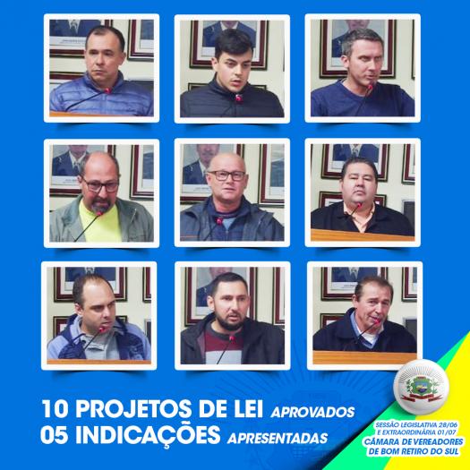 Na última Sessão Ordinária, onze matérias foram aprovadas pelos legisladores municipais, sendo um Projeto de Lei de origem legislativa, cinco Projetos de Lei de origem executiva e cinco indicações de melhorias pelos legisladores municipais. No dia 1º de Julho, quinta-feira, aconteceu também a Sessão Extraordinária, onde foram aprovadas quatro Projetos de Lei de origem executiva.