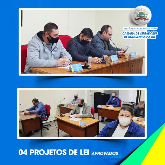 Na Sessão Extraordinária realizada na última segunda-feira, dia 19 de julho, quatro Projetos de Lei foram aprovados pelos legisladores municipais. Vale ressaltar, que a Câmara Municipal continua em recesso até o dia 03 de agosto, quando retorna as Sessões Ordinárias, com transmissão ao vivo pela página no Facebook.