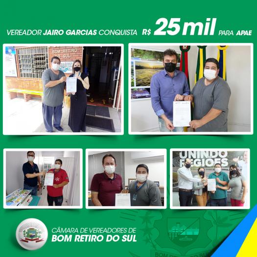 O vereador Jairo Martins Garcias entregou na última semana para os representantes municipais, o ofício em apoio aos municípios na assistência à pessoa com deficiência e necessidades especiais, do Órgão Secretaria de Igualdade, Cidadania, Direitos Humanos e Assistência Social, onde repassa recursos aos municípios por meio de convênios para a qualificação do atendimento de pessoas com deficiência e necessidades especiais, no valor de R$ 25 mil.