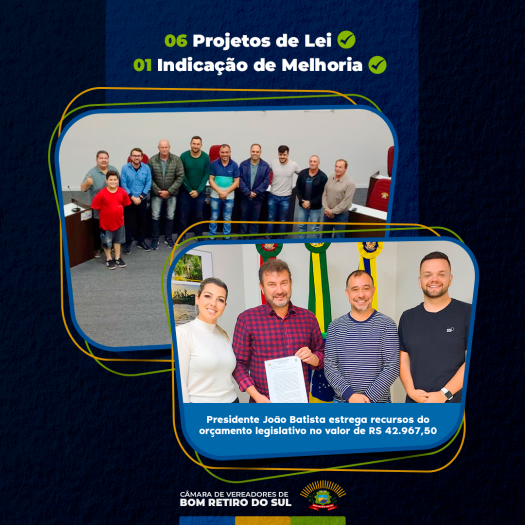 Também na terça-feira, o Presidente da Câmara de Vereadores, João Batista Ferreira, fez a entrega para o Prefeito Edmilson Busatto do repasse de recursos do orçamento legislativo de R$ 42.967,50 referente ao duodécimo.