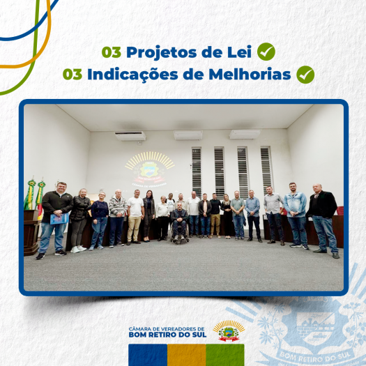A próxima sessão da Câmara de Vereadores de Bom Retiro do Sul está marcada para o dia 27 de maio, com transmissão ao vivo pelas redes sociais da Câmara.