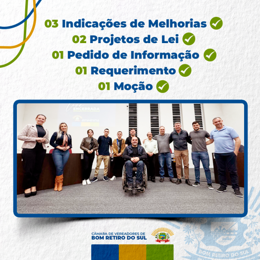 A sessão reforçou o compromisso da Câmara Municipal com a fiscalização, a valorização dos serviços públicos e a busca por melhorias para a qualidade de vida da população de Bom Retiro do Sul.