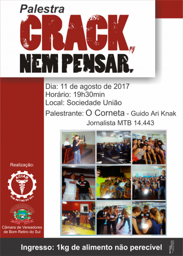 Guido Ari Knak – O Corneta da RBS estará em Bom Retiro do Sul na próxima sexta-feira 11 de agosto, trazendo a toda a comunidade um relato sobre a destruição causada pelas drogas e alertando jovens e adultos sobre os problemas gerados por elas. O evento ocorre às 19h30min, na Sociedade União Bom-retirense e é uma promoção conjunta da ACIAB e Câmara de Vereadores de Bom Retiro do Sul, por iniciativa do vereador Tiago Pedroso.